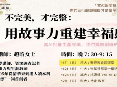 職青及港大團契聯合講座 講座分享:詹崇新長老 小組分享:多位從事金融、科研、法律、科技、教育等行業的前輩 2025年11月1日 週六2-5pm 香港聖經教會西環堂