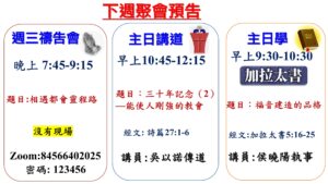 主內平安!  觀塘堂本周日主日崇拜的安排如下: