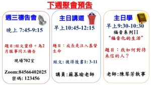 主內平安!  觀塘堂本周日主日崇拜的安排如下: